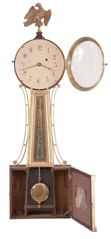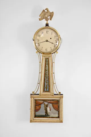 Unknown, 8 day, weight brass movement patent or banjo timepiece. This looks to be a modern made case using an old movement, door and throat frame. The gilding on the door looks to have been redone. The bottom tablet is broken and has a backing to protect it. The modern dial has some inpainting in a few places with paint that does not quite match the original. Modern hands. Modern brass bezel.