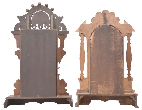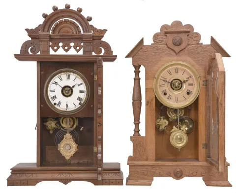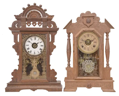 Clocks -2 (Two): (1) Russell & Jones Clock Co., Pittsfield, Mass., "Detroit" shelf clock with a spring driven 8 day time, strike and alarm movement in an oak case. c1890. (2) Seth Thomas Clock Co., Thomaston, Conn., "Eclipse" shelf clock with a spring