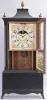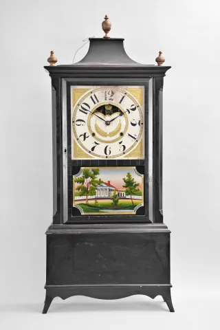 An old shelf clock case, perhaps Colonial Revival or earlier, now fitted with a Birge, Mallory & Co., Bristol, Conn., 8 day, time and strike weight strap brass movement, c1840. An interesting ebonized case is nice condition in original finish with pagoda top and French feet. The original Birge & Mallory painted wood dial has some burn marks behind the number 12 on the dial that resulted in paint damage. The dial's sliding mirror is missing, but original hands are present. An original Birge & Mallory backboard with label and gong has been fitted to the case. The tablet is by Tom Moberg. Weights are inside the case as there is no room to remove them.