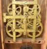 An interesting ebonized case is nice condition in original finish with pagoda top and French feet. The original Birge & Mallory painted wood dial has some burn marks behind the number 12 on the dial that resulted in paint damage. The dial's sliding mirror is missing, but original hands are present. An original Birge & Mallory backboard with label and gong has been fitted to the case. The tablet is by Tom Moberg. Weights are inside the case as there is no room to remove them.