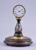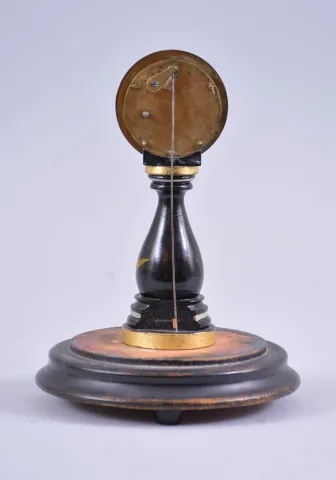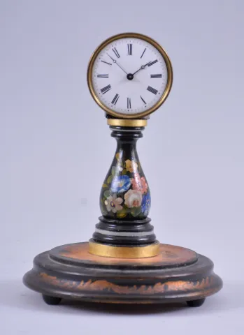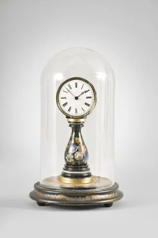 A small, European candlestand clock, ebonized baluster form base with floral decoration supporting a roman numeral white enamel dial with blued steel Breguet style hands, 30 hour timepiece movement with tic tac escapement, all mounted to a decorated turned wooden base with glass dome clock base with crazing, otherwise good, dial dirty, hands with minor oxide, movement oily, ticking, pendulum bob missing, dome base lackingfabric lining, dirty, dome good