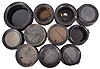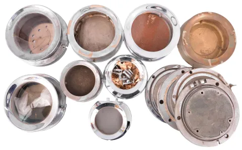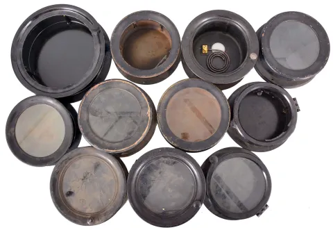 18 (Eighteen) Marine Clock Cases: black painted wood and brass, black phenolic, and nickel-plated brass marine clock cases by various makers in assorted sizes. A number of nickel plated wall mounting plates are also included.