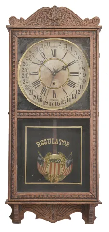 (1) Paper dial is stained. Original finish in fairly good condition. Correct hands. American flag decal on lower glass is a later addition. Black paint around dial is degrading. Central portion of crest is missing revealing that the portion that is normally hidden has lion's face. (2) Case finish has darkened and formed very fine wrinkles. Graphics on throat and door tablet are still clear. Silvered dial in good condition. Proper hands and finial. Dimensions are for the Observatory (1) .
