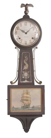 Clocks- 2 (Two): (1) William L. Gilbert, Winsted, Conn., "Observatory" hanging clock, 8 day time and simple calendar, spring driven movement in an oak case, c1913; (2) E. Ingraham, Bristol, Conn., "Yankee Clipper" banjo clock, 8 day, time and strike, spring driven movement in a wood case with nautical theme, c1934. (1) Paper dial is stained. Original finish in fairly good condition. Correct hands. American flag decal on lower glass is a later addition. Black paint around dial is degrading. Central portion of crest is missing revealing that the portion that is normally hidden has lion's face. (2) Case finish has darkened and formed very fine wrinkles. Graphics on throat and door tablet are still clear. Silvered dial in good condition. Proper hands and finial. Dimensions are for the Observatory (1) .