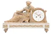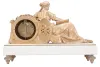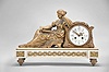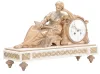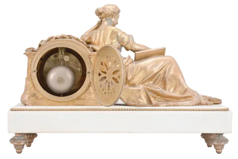 The white marble case is in very good condition. Some of the original gilding on ornaments and clock portion is intact. Much of the figure has been touched up with gold paint, but it looks good. Dial, convex beveled glass, and hands are all very good. Back of the case is stamped "Covington, New York" and has an applied medallion indicating that it was a product of France. The unsigned movement has rack strike that sounds on a bell.
