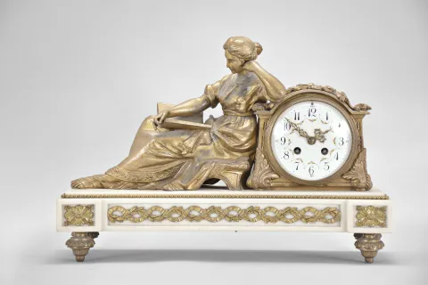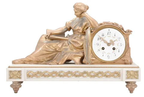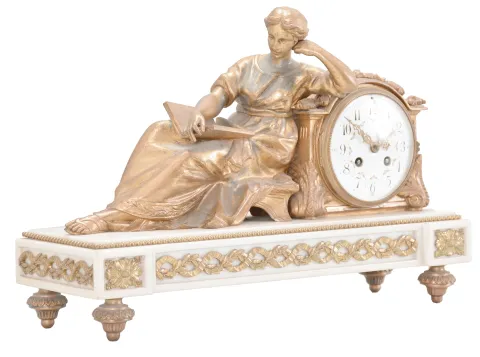 France, figural mantel clock, 8 day, time and strike, spring driven pendule de Paris movement in a cast metal case mounted on a white marble base with cast gilt feet and applied ornaments, the clock with white enamel dial, polychrome garlands, and Louis XV style hands, all adjacent to the figure of a seated woman reading a book. The white marble case is in very good condition. Some of the original gilding on ornaments and clock portion is intact. Much of the figure has been touched up with gold paint, but it looks good. Dial, convex beveled glass, and hands are all very good. Back of the case is stamped "Covington, New York" and has an applied medallion indicating that it was a product of France. The unsigned movement has rack strike that sounds on a bell.
