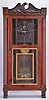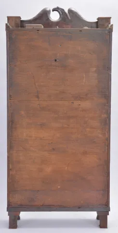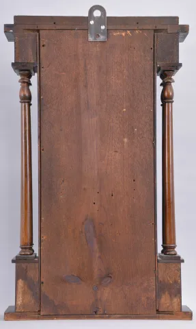 (1) Mahogany and rosewood veneered case in nice condition with remains of original finish. Original painted dial in nice condition also. Original hands and tablet. Clean label inside. (2) Mahogany and mahogany veneered case in an old finish has been partially restored. Based on the column and label design someone has over pasted a reproduction Terry, Jr. label over a Seth Thomas Label. Some repairs to the door veneer. Feet are a replaced. Dial is missing. Someone has put side lights in the case. (3) Refinished mahogany and tiger maple columns case has a couple small veneer pieces missing. Original painted dial is in nice condition. Original hands. Period mirror. Clean label inside.