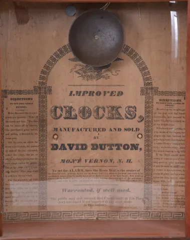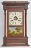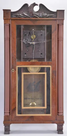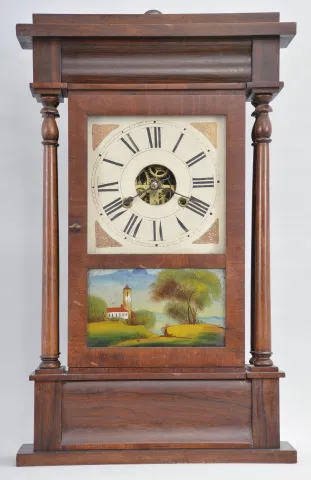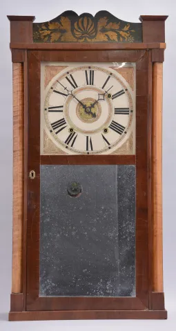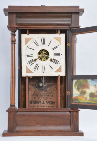 Clocks- 3 (Three) :,(1) Bloomer & Sperry, New York, 30 hour, time and strike weight brass movement 4-column and OG molding shelf clock. c1845 (2) Eli Terry, Jr., Terrysville, Conn., 8 day, time and strike weight wood movement half column & eagle splat shelf clock. c1830 (3) David Dutton, Mount Vernon, New Hampshire, 30 hour, time, strike and alarm quarter column & splat shelf clock. c1830 (1) Mahogany and rosewood veneered case in nice condition with remains of original finish. Original painted dial in nice condition also. Original hands and tablet. Clean label inside. (2) Mahogany and mahogany veneered case in an old finish has been partially restored. Based on the column and label design someone has over pasted a reproduction Terry, Jr. label over a Seth Thomas Label. Some repairs to the door veneer. Feet are a replaced. Dial is missing. Someone has put side lights in the case. (3) Refinished mahogany and tiger maple columns case has a couple small veneer pieces missing. Original painted dial is in nice condition. Original hands. Period mirror. Clean label inside.