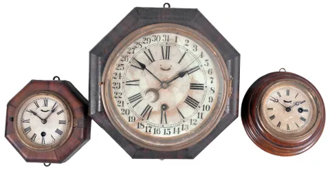 Clocks- 6 (Six) Marine and wall Clocks: most by Waterbury Clock Co. including their "Ship's Bell No. 11" on wood stand, c1915; a ship's bell in the form a yacht wheel in a nickel case on wood stand, 8 inch, c1929, an "Octagonal Lever" with simple calendar