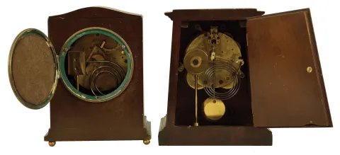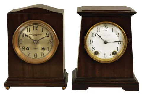 Clocks- 2 (Two) Mahogany Mantel: (1) Chelsea Clock Co., Boston for Smith, Patterson Co., Boston, "Babro No. 105" mantel clock, 8 day, time and house strike, spring-driven movement in a mahogany case with 4 inch silvered dial, serial number 109644, c1917: