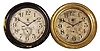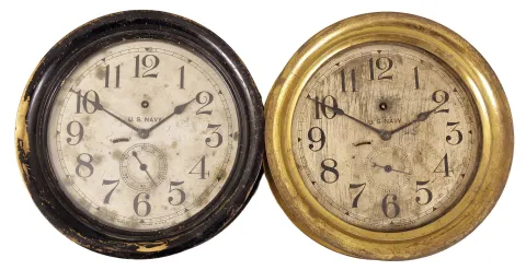 Clocks- 2 (Two) Seth Thomas Ship's Lever: Seth Thomas Clock Co., Thomaston, Conn., "Ship's Lever No. 8", 8 day, time only, spring-driven, balance wheel movements in brass cases with hinged bezels, one painted black, 8.5 inch silvered dials with subsidiary