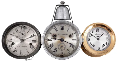 Clocks- 3 (Three) Seth Thomas Marine: Seth Thomas Clock Co., Thomaston, Conn., "Kenyon" ship's strike clock, "Yacht Clock" with top-mounted bell, and "Day Lever ".