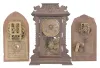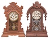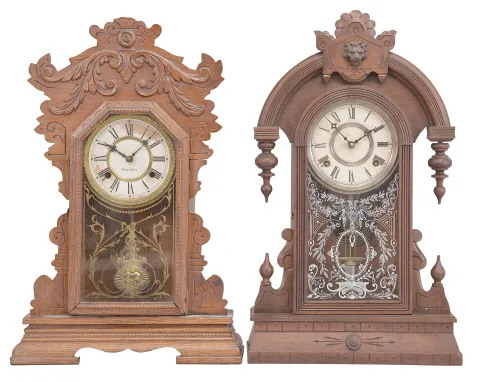 Clocks- 3 (Three): (1) Waterbury Clock Co., "Kingsland" clock, 8 day, time and strike, spring driven movement in an oak case, c1906; (2) George B. Owen, Winsted, Conn., mantel clock, 8 day, time and strike, spring driven movement in a walnut case, c1885;