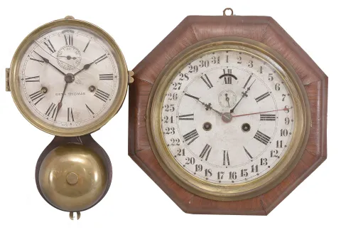 Clocks- 2 (Two): (1) Seth Thomas Clock Co., "Ship's Bell" marine clock, 30 hour, time and strike, spring driven balance wheel movement in a brass case with external bell, c1884; (2) E.N. Welch, "Calendar Lever" timepiece, 8 day, time and simple calendar, double-spring driven movement with lever escapement in an octagonal mahogany veneer case with painted metal dial, c1872. (1) Glass is broken. Dents to top of bezel. Silvered dial lightly tarnished. No rear label. (2) Bezel will need to be soldered to hinge. Paper dial spotted and lightly worn. All hands appear original. Partially complete rear label. Dimensions are for the Calendar Lever (2) .