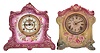 (1) The case with vibrant purple color and painted gold accents is in excellent condition. Outer portion of the dial has one hairline crack. Pallets are steel. Beveled glass is good. (2) The case is in very good condition. The paper dial has darkened and a small piece is missing at the bottom. Movement/dial assembly is a bit loose. Dimensions are for the La Lorne (1)