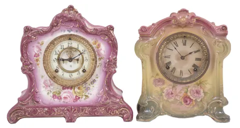Clocks- 2 (Two) Porcelain mantel: (1) Ansonia Clock Co., New York, "La Lorne" mantel clock, 8 day, time and strike, spring driven movement with visible Brocot escapement in a richly decorated Royal Bonn porcelain case with two-piece enamel dial, c1900; (2) Ansonia Clock Co., New York, "La Sedan" mantel clock, 8 day, time and strike, spring driven movement in a polychrome Royal Bonn porcelain case, c1914; (1) The case with vibrant purple color and painted gold accents is in excellent condition. Outer portion of the dial has one hairline crack. Pallets are steel. Beveled glass is good. (2) The case is in very good condition. The paper dial has darkened and a small piece is missing at the bottom. Movement/dial assembly is a bit loose. Dimensions are for the La Lorne (1)