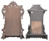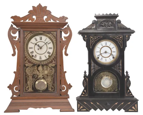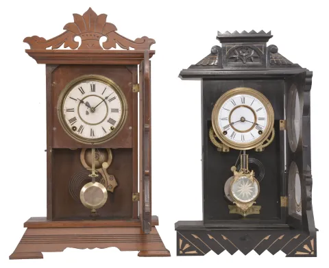 (1) Walnut case in nice condition in original finish. Original painted dial has some loss in the center, near 9 o'clock and wear to the chapter ring. Original hands and pendulum. (2) Ebonized wood case in very nice condition in original finish. Original porcelain dial has a couple hairline cracks in the center and a small chip at the timeside winding arbor. Original hands and pendulum. Original tablet is cracked. Stained label on the back.
