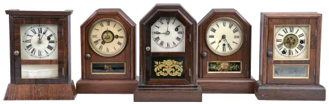 Clocks- 5 (Five): American-made 30 hour cottage clocks, some with alarm, by Atkins Clock Co. and Seth Thomas.