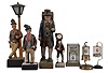 Novelties- 7 (Seven): lot includes: carved figure leaning on a lamp post which holds a small incandescent bulb; plastic battery-operated whistler figure; small clock peddler figure with quartz watch movement; large cast clock peddler figure with German
