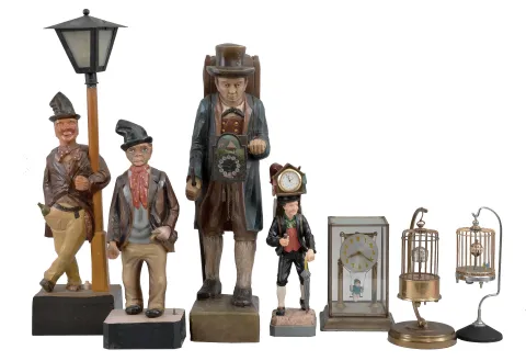 Novelties- 7 (Seven): lot includes: carved figure leaning on a lamp post which holds a small incandescent bulb; plastic battery-operated whistler figure; small clock peddler figure with quartz watch movement; large cast clock peddler figure with German novelty clock movement; Japanese swinging doll clock under glass; German made birdcage clock; Japanese made birdcage clock. clocks and figures in reasonably good cosmetic condition. All need mechanical attention. Dimensions are for the larger clock peddler figure. Sold "as is ".