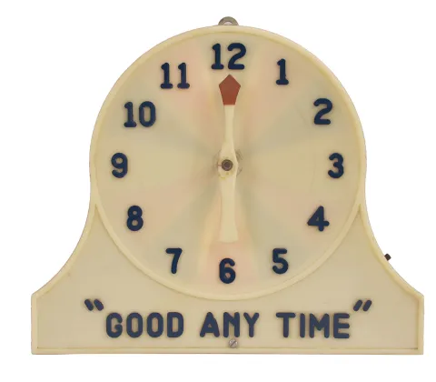 Clocks- 8 (Eight) Advertising: small advertising clocks by Ansonia, Sessions, New Haven, and Waterbury advertising Camel Brand Belting, Fleischmann's Yeast, Loewi Hops, Old Somerset Club Whiskey, and Anderson, Clayton & Co. Cotton. Also included is a internally illuminated electric advertising display in the form of a clock reading "Good Any Time ". Electric advertising display is not meant to tell time. Rather, every few minutes the single hand spins around the dial very quickly, stopping on a random hour. Dimensions are for the electric advertising display. Sold "as is ".