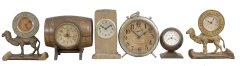 Clocks- 8 (Eight) Advertising: small advertising clocks by Ansonia, Sessions, New Haven, and Waterbury advertising Camel Brand Belting, Fleischmann's Yeast, Loewi Hops, Old Somerset Club Whiskey, and Anderson, Clayton & Co. Cotton. Also included is a