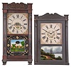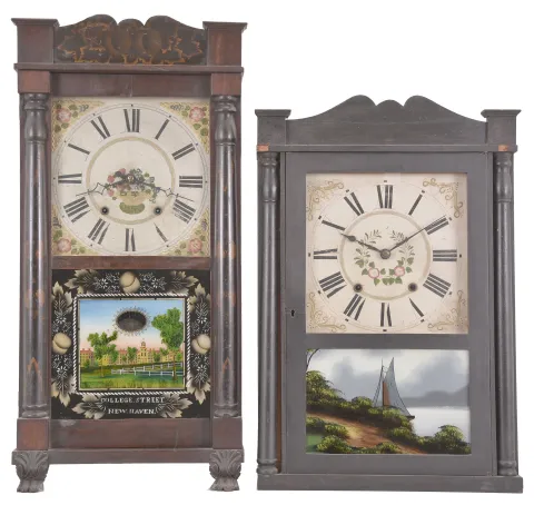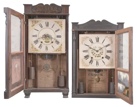 (1) Mahogany and mahogany veneered case in original finish has original stencils, some damage to one toe on the left foot, a veneer repair on the door and small piece missing the right return. Original painted dial has some wear at the time side winding arbor. Original hands. Tablet is replaced. Clean label inside. (2) Mahogany and mahogany veneered case in original finish shows the original stenciling on the splat under the dark finish. Painted tablet is replaced. Original painted dial in nice condition. Replaced hands. Splat has repaired crack. Clean label inside.