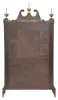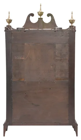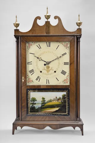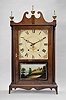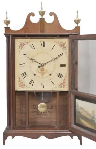 Mahogany and mahogany veneered case in an old finish has a veneer repair on the skirt, a repair to the left foot and repairs to the door and cross strip. Scrolls have been repaired and reveneered. Two holes in the restored dial have been plugged. The movement was made by Seth Thomas. Reverse painted tablet is replaced. Nice set of reproduction Seth Thomas type finials.
