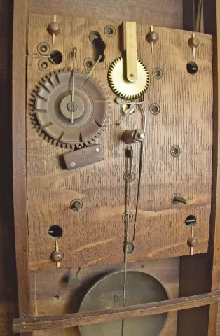 Seth Thomas Clock Co., Plymouth, Conn., 30 hour, time and strike weight wood movement pillar & scroll shelf clock.