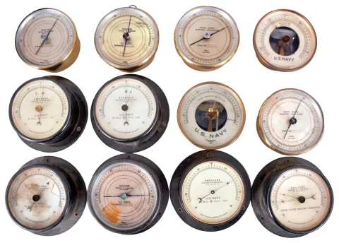 Barometers- 12 (Twelve) Barometers: 12 aneroid barometers for the U.S. Navy and U.S. Maritime Commission by Fee & Stemwedel of Chicago, Friez of Baltimore, and Taylor Instrument Companies of Rochester, New York.