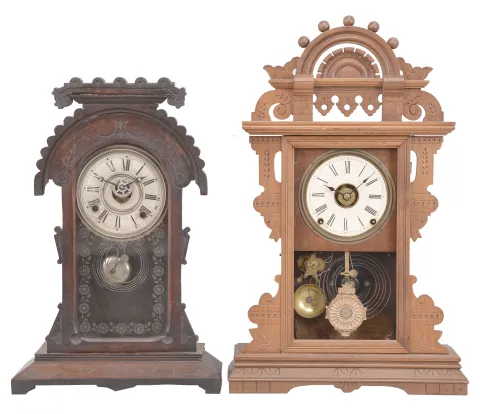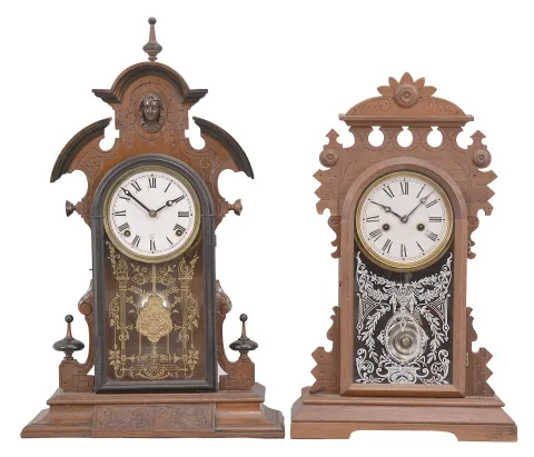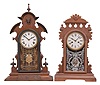 Clocks- 4 (Four): (1) "Japanese" model mantel clock, with E. N. Welch 8 day, time and strike, spring driven movement in walnut case, c1875; (2) E.N. Welch, "Amorita" mantel clock, 30 hour, time and strike, spring driven movement in a walnut case, c1886;