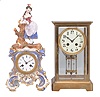 Clocks- 2 (Two): (1) France, mantel clock, 8 day, time and strike, spring driven movement with silk thread suspension in a two-piece porcelain figural case, c1840; (2) Japy Freres & Cie, Paris, crystal regulator, 8 day, time and strike, spring driven