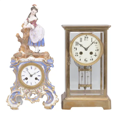 Clocks- 2 (Two): (1) France, mantel clock, 8 day, time and strike, spring driven movement with silk thread suspension in a two-piece porcelain figural case, c1840; (2) Japy Freres & Cie, Paris, crystal regulator, 8 day, time and strike, spring driven pendule de Paris movement with compensating pendulum in a glazed brass case, c1905. (1) Enamel dial with hairline cracks and two small filled losses. Female figure with repaired break at the waist. Diminutive movement is unsigned. No back to the case so was once under a dome. (2) Good overall condition. The brass is lightly tarnished. Good dial. Back door is difficult to open. There is a crack in the top of one of the pendulum vials, but it is not leaking. Dimensions are for the crystal regulator