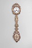 White enamel dial has two very fine hairline cracks that are barely visible. The back of the pressed brass fronton has been filled with a black body filler to support and stabilize it. The movement will need cleaning. Some tarnish on pressed brass pendulum. No weights are included with this lot.