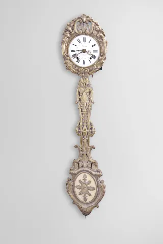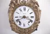 France, Morbier or Comtoise clock, 8 day, time and strike with simple calendar, weight driven movement with anchor escapement in an iron post and plate frame, convex white enamel dial with Roman numerals signed "Dufour Ernee", press brass fronton and matching pendulum with scroll design, two pierced brass hands an one iron hand. White enamel dial has two very fine hairline cracks that are barely visible. The back of the pressed brass fronton has been filled with a black body filler to support and stabilize it. The movement will need cleaning. Some tarnish on pressed brass pendulum. No weights are included with this lot.