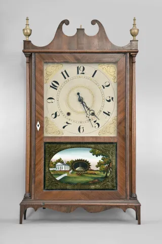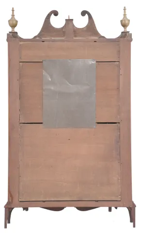 Refinished mahogany veneered case has a veneer repair on the skirt, both scrolls have been repaired and an old chip on the front base molded edge. Original painted dial is in nice condition for its age. Hour hand is original, but period minute hand is a replacement. Both glasses are replaced. Original Samuel Terry movement. Clean label inside. Two period finials. Case still has original shipping pins.