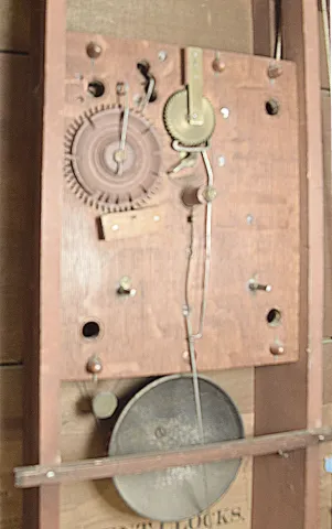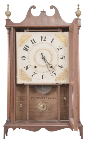 Samuel Terry Plymouth, Conn., 30 hour, time and strike weight wood movement pillar & scroll shelf clock.