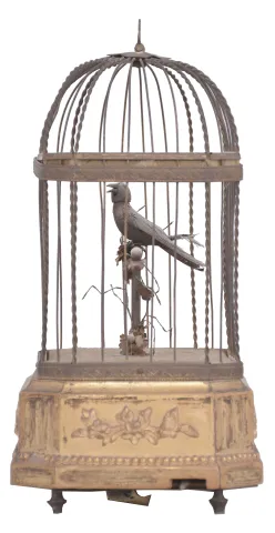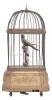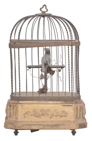 France, singing bird automaton, spring driven movement powers birdsong, as well as head, beak and tail feather motions, mounted on a gilt wood base with fluted canted corners and applied floral ornaments, the bird enclosed in a wire cage with velvet lined