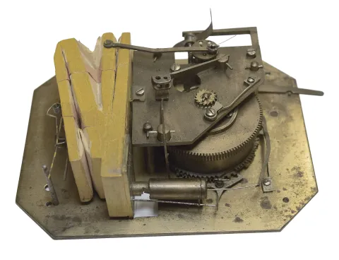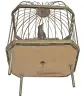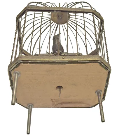 The feathers on the bird are present though they are very dirty. The tail feathers that move are in some disarray. Velvet on base is dusty and worn. Brass cage has a very dark patina. The gilding has worn off of the high spots on the wood base. The leaves, flowers, and berries around the bird's perch are incomplete. The bellows have been restored in recent times and look sound. The motor runs vigorously, but the bird does not sing as it should so an air leak will have to be located. Head and beak motions function, but some of the tail feathers may be inhibiting the full action. The unsigned movement is stamped only with "63 ". It is quite possible that this piece is Swiss or German. The latter is especially likely because when some of the French firms closed, they sold their tooling to German companies who continued production of existing French models.