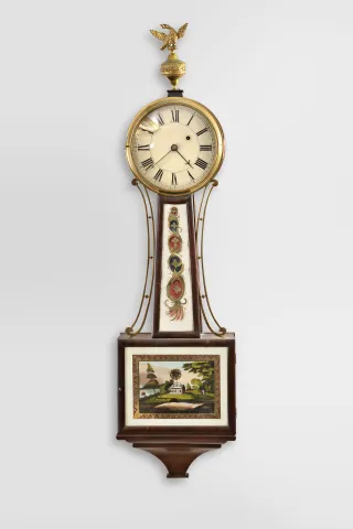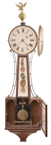 Massachusetts, 8 day, weight brass movement patent or banjo timepiece. Mahogany case in nice condition in original finish. The case has a chestnut backboard. The dial is mounted to the case with three L-turns and has some loss a the mounting pins and small chip. Original throat tablet. Bottom tablet is old, but likely replaced. The movement is attached to the case with taper pins through short studs screwed into the backboard. The finial is period as it is made of thin brass. The bottom finial is missing.