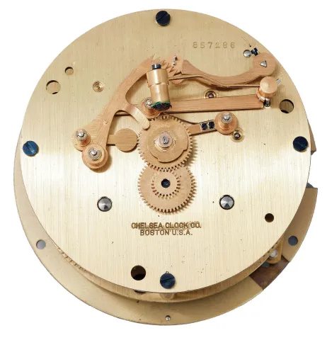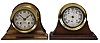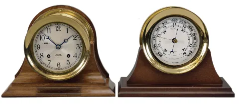 Chelsea Clock Co., Boston, Mass., marine clock, 8 day, time and ship's bell, spring driven movement with jeweled escapement in a brass case with screw-on bezel, 4 inch silvered dial mounted to a mahogany stand. Lot also includes a Chelsea barometer with a 4 inch white dial on a dark mahogany stand. clock has a brass case with a bit of haze from the protective lacquer degrading. Silvered dial and hands are excellent Somewhat uneven finish on the wood base and a dark section on the front where a dedication plaque was removed. Barometer case is bright and excellent white signed dial is in very good condition. Movement serial number 857186. Not exactly a set, but a handsome pair.