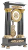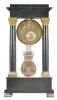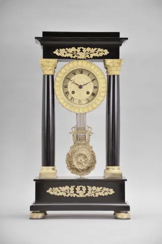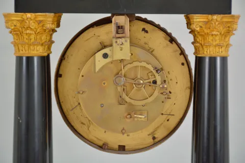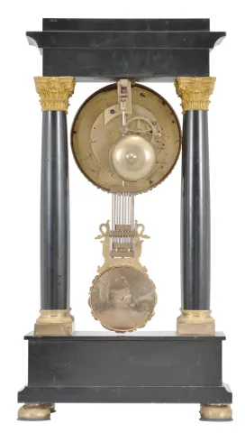 France, Empire portico clock, 8 day, time and strike, spring driven pendule de Paris movement in a polished black slate case on cast brass feet, the base and top with applied gilt rose ornaments, four Corinthian columns with gilt bases and capitals, the gilt bezel with repeating acanthus leaf design, gilt chapter ring with Roman numerals, cast dial center and gridiron pendulum both with floral designs, blued steel Breguet hands. There are some very small chips to the stone case along the edges and one slightly larger chip on the front center of the base. Original gilt surfaces are very good. The finish on the hands is slightly dulled from oxidation. The suspension block has been augmented to be adjustable. The unsigned movement strikes with a count wheel and bell.