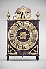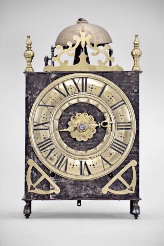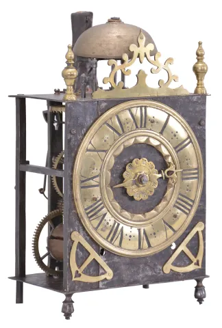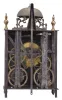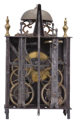 The iron front is in two pieces with a seam running along the left side behind the chapter ring. Visible brass parts have been cleaned and show fine scratches. Some light rust on iron and steel parts. Both wood winding drums have large cracks. Many fine construction details within the movement including: decorative nuts, turned steel linkages and supports, and a curlicue on the end of strike trip lever. This clock has an uncommon pivoted and curved rack with teeth on both sides. Unlike most clocks of this vintage, it also employs one counterweight within the strike train. Movement pillars have a slight flare with triangular cutout in the bottoms. Four bladed iron fly. Three hammers: one for hour strike, one for passing strike on the half hour, and one for the alarm. Sides and back are absent. The clock does not come with weights or a pendulum. This clock was sold by Ivoire Saint-Etienne on October 13th, 2012 as lot number 57.