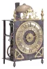 France, Comtoise lantern clock, 8 day, time and strike with alarm, weight driven movement with verge escapement, thread suspension with rear-hanging pendulum in a posted iron frame case, heavy brass chapter ring with Roman numerals, single brass hand,