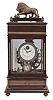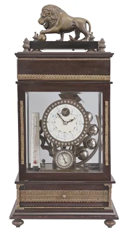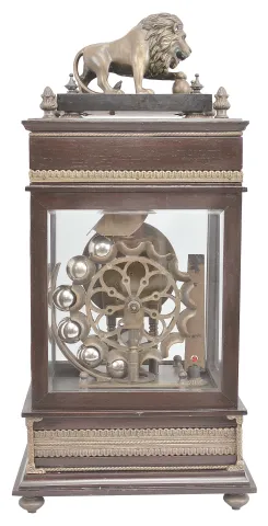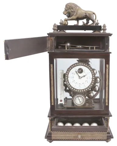 Reproduction Ferris wheel gravity timepiece, 8 day, time only, weight driven balance wheel movement in a glazed wood case with applied brass ornaments, polychrome enamel dial, a small barometer dial below, and alcohol thermometer adjacent, all surmounted by a patinated brass lion. Case with a few small dents on the back side is in very good overall condition. Nice patina on the cast metal elements. Dial with brilliants is in fine condition. Comes with a set of steel balls. She steel balls are loaded onto an inclined plane in the top front compartment of the clock from which they role down to fill the chambers of the Ferris wheel assembly located in the rear of the clock. The weight of the balls causes the wheel to rotate which in turn drives the mechanism. The balls drop from the Ferris wheel into the base of the clock which is accessed from a drawer in the front.