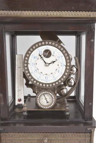 Reproduction Ferris wheel gravity timepiece, 8 day, time only, weight driven balance wheel movement in a glazed wood case with applied brass ornaments, polychrome enamel dial, a small barometer dial below, and alcohol thermometer adjacent, all surmounted