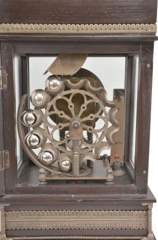 Case with a few small dents on the back side is in very good overall condition. Nice patina on the cast metal elements. Dial with brilliants is in fine condition. Comes with a set of steel balls. She steel balls are loaded onto an inclined plane in the top front compartment of the clock from which they role down to fill the chambers of the Ferris wheel assembly located in the rear of the clock. The weight of the balls causes the wheel to rotate which in turn drives the mechanism. The balls drop from the Ferris wheel into the base of the clock which is accessed from a drawer in the front.