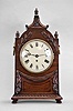 England, a 19th century mahogany bracket clock with passing strike, the case on turned wooden feet, the base with quarter round, and bead and reel moldings below a carved festoon, the upper part of the case with two carved laurel fronds, turned, carved