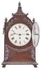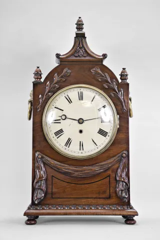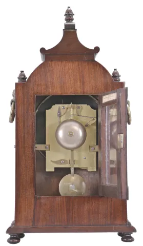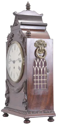 England, a 19th century mahogany bracket clock with passing strike, the case on turned wooden feet, the base with quarter round, and bead and reel moldings below a carved festoon, the upper part of the case with two carved laurel fronds, turned, carved finials, and pagoda top with carved, partial C scrolls and bellflower, the sides with pierced brass, lancet arch frets, and stamped, ring handles with floral mounts, roman numeral white painted dial with blued steel Breguet style hands, 8 day fusee timepiece with shouldered plates, recoil escapement, and passing strike at the hour, brass pendulum with brass clad bob case refinished, lacquer with runs, feet replaced, handles, frets and bezel with minor tarnish, dial with crazing, minor scratches and losses, hands with minor oxide, movement clean, with minor marks and scratches, ticking, strike operational, pendulum with minor tarnish and spotting, pendulum locking screw missing