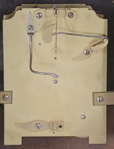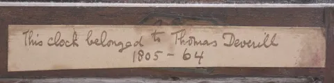 case refinished, lacquer with runs, feet replaced, handles, frets and bezel with minor tarnish, dial with crazing, minor scratches and losses, hands with minor oxide, movement clean, with minor marks and scratches, ticking, strike operational, pendulum with minor tarnish and spotting, pendulum locking screw missing